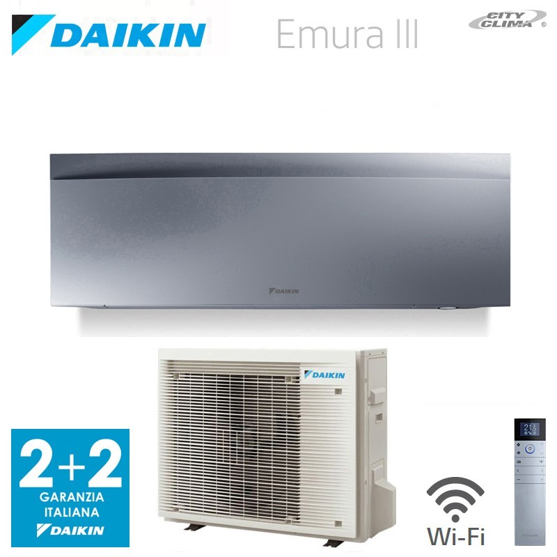 Unità interne Emura con pannello frontale e corpo silver con filtri Silver Allergen e apatite di titanio, sensore di presenza a due aree di azione, flusso d’aria 3D e scheda Wi-Fi online controller BRP069B41 inclusa nella confezione dell’unità interna.